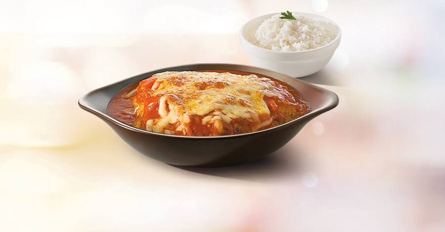 Delicioso file de frango a parmigiana acompanhado de arroz.